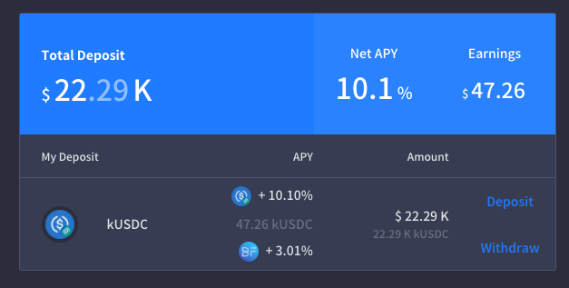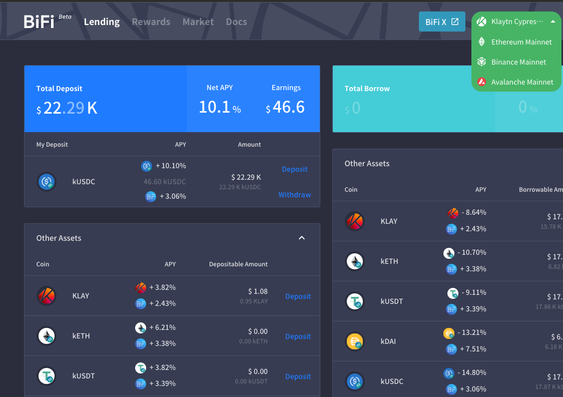 현재 eth 는 투자금이 소액이라 가스비가 부담되서 중지하고, BSC 와 최근 런칭한 AVAX / KLAY 기반 랜딩서비스를 이용중이다.