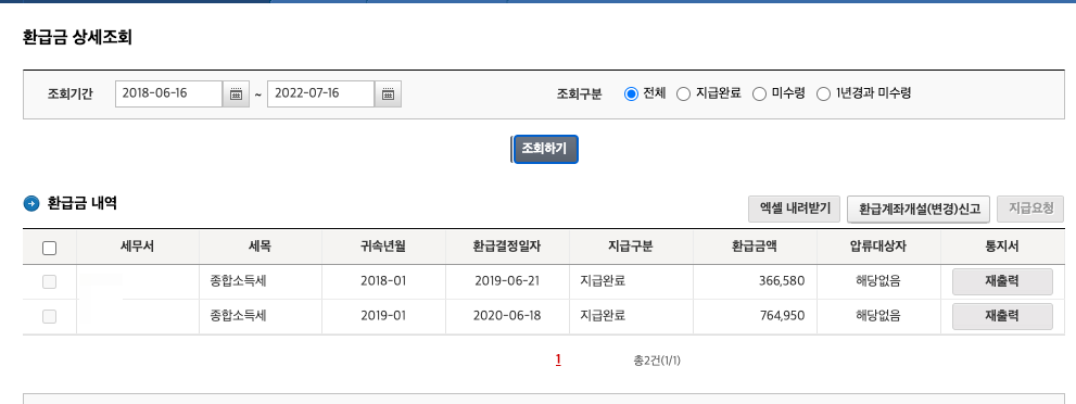 지난 5년을 조회가능하다. 해보니 난 2건이 있었다.(이미 환급은 받았다.)