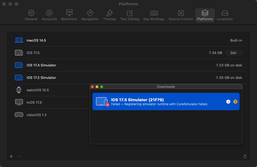 Downloading iOS 17.5 Simulator (21F79): Error: Error Domain=NSPOSIXErrorDomain Code=28 "No space left on device" UserInfo={NSErrorFailingURLStringKey=https://download.developer.apple.com/Developer_Tools/iOS_17.5_Simulator_Runtime/iOS_17.5_Simulator_Runtime.dmg, NSErrorFailingURLKey=https://download.developer.apple.com/Developer_Tools/iOS_17.5_Simulator_Runtime/iOS_17.5_Simulator_Runtime.dmg, _NSURLErrorRelatedURLSessionTaskErrorKey=(