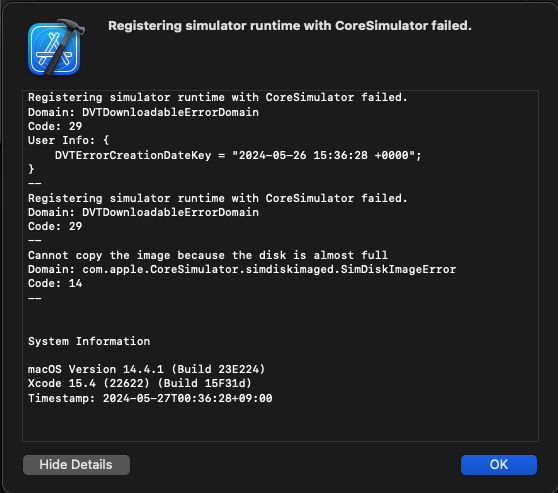 Downloading iOS 17.5 Simulator (21F79): 83.1% (6.09 GB of 7.34 GB)2024-05-27 00:10:48.511 xcodebuild[38139:36929395] DVTDownloadable: Download Failed. Downloadable: https://download.developer.apple.com/Developer_Tools/iOS_17.5_Simulator_Runtime/iOS_17.5_Simulator_Runtime.dmg. Error Domain=NSPOSIXErrorDomain Code=28 "No space left on device" UserInfo={NSErrorFailingURLStringKey=https://download.developer.apple.com/Developer_Tools/iOS_17.5_Simulator_Runtime/iOS_17.5_Simulator_Runtime.dmg, NSErrorFailingURLKey=https://download.developer.apple.com/Developer_Tools/iOS_17.5_Simulator_Runtime/iOS_17.5_Simulator_Runtime.dmg, _NSURLErrorRelatedURLSessionTaskErrorKey=(