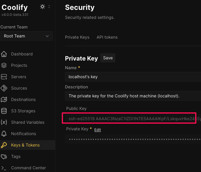 coolify 가 원격서버에 접속할 수 있도록 ssh key 등록을 해준다.(아래 이미지의 localhost's key )