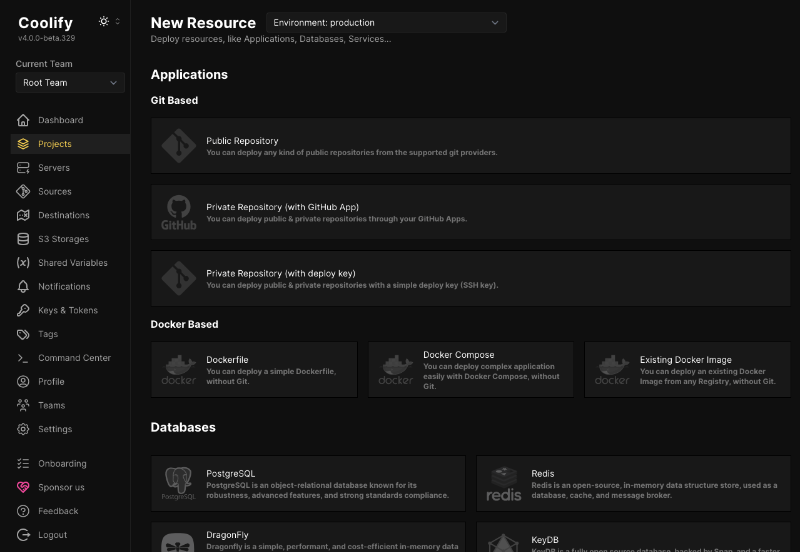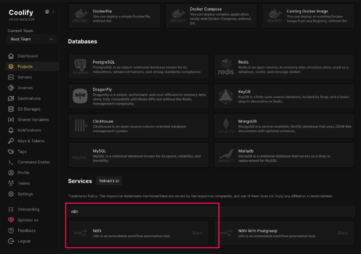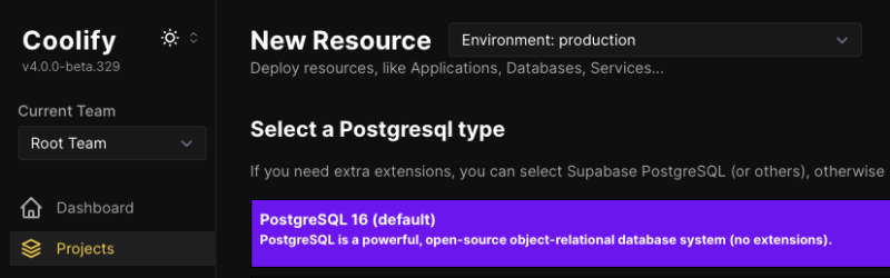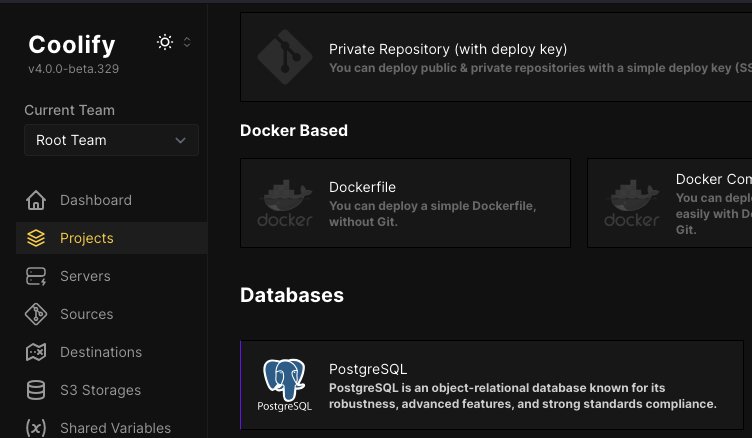 Coolify 에서는 3가지 항목이 있다.(W 라 맨 아래에 있다.) Mariadb / Mysql / No DB 중에 선택할 수 있다.