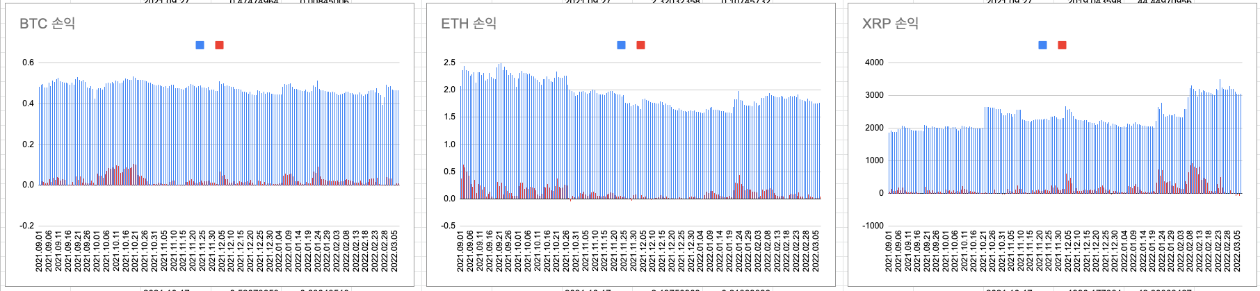 BTC/ETH/XRP 를 40~50개의 매수/매도 전략으로 분산해서 하고 있다.(XRP 만 수익상태이고, 나머지는 손실상태이다.) 하락장이라 어쩔 수 없는 것인지, 추후 상승장의 성과를 기대하고 있다.