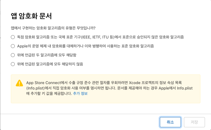 testFlight 쪽을 보면, 해당 앱이 등록이 되는데. 다음과 같은 메시지가. 수출관련 인 듯 한데, 일단 모두 해당하지 않음 으로 처리.