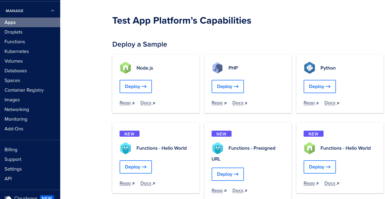 Droplets 라는 서버자체를 사용할 수도 있지만, app 형태나 kubernetes (docker) 형태로도 사용할 수 있다.